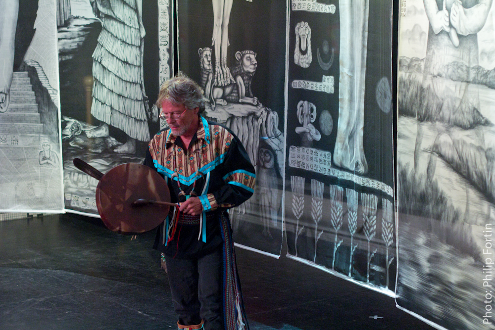 Installation monumentale immersive qui nous plonge à travers le temps et l’espace, au cœur d’une expérience esthétique et spirituelle. Temple initiatique d’étoffe soyeuse, elle nous invite au voyage intérieur. On en revient régénérés pour mieux célébrer la vie dans le mouvement sensuel et les vibrations de couleurs éclatantes. Bain Mathieu, Juillet 2014